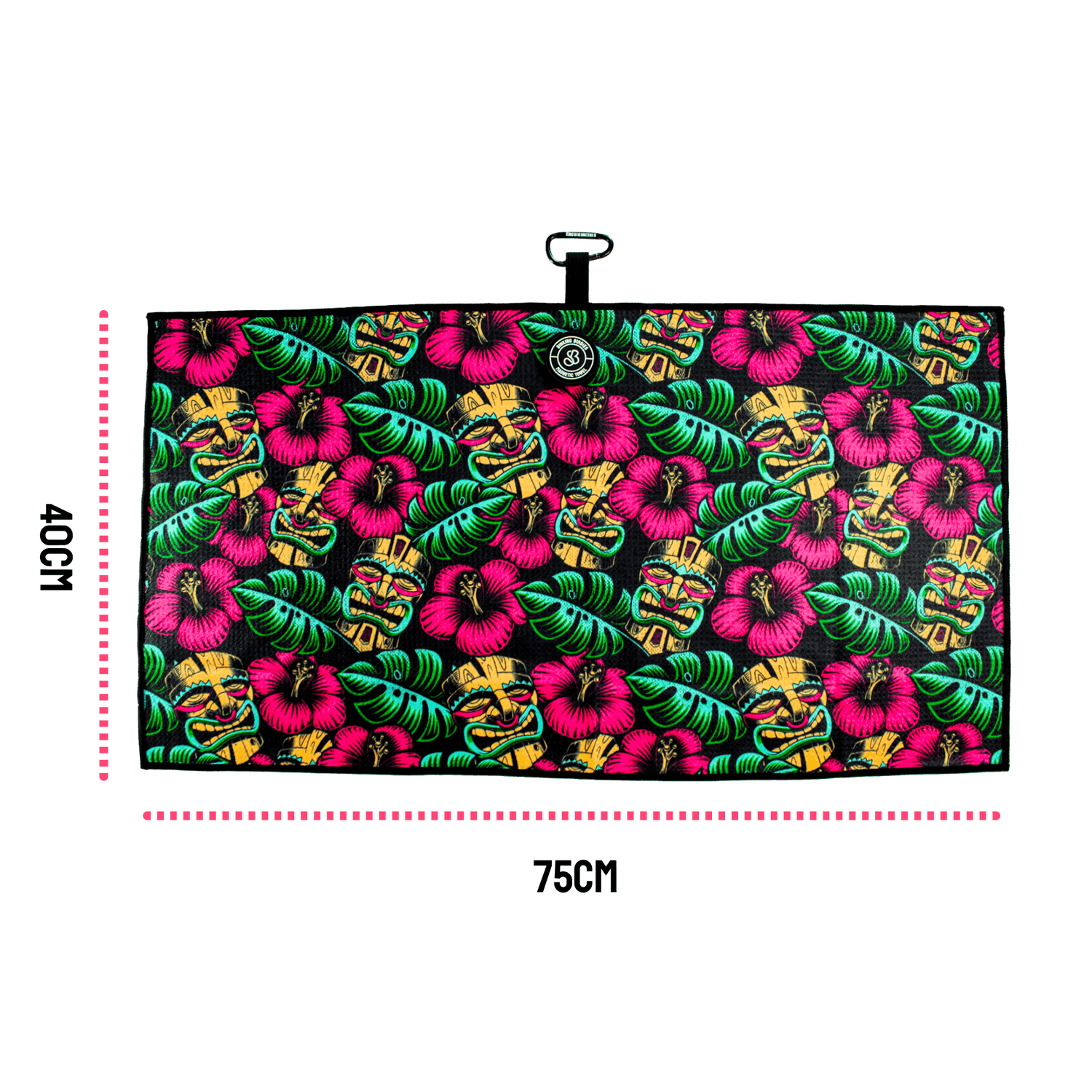 Bring that good luck charm to the course with the Tiki Tap-in golf towel, adorned with lively tropical tiki totems amidst lush green jungle leaves and vibrant red flowers.